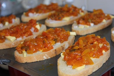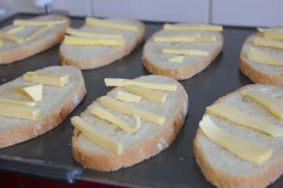 Đặt bánh mì vào khay nướng và cắt bơ để lên ( hay trét bơ lên)