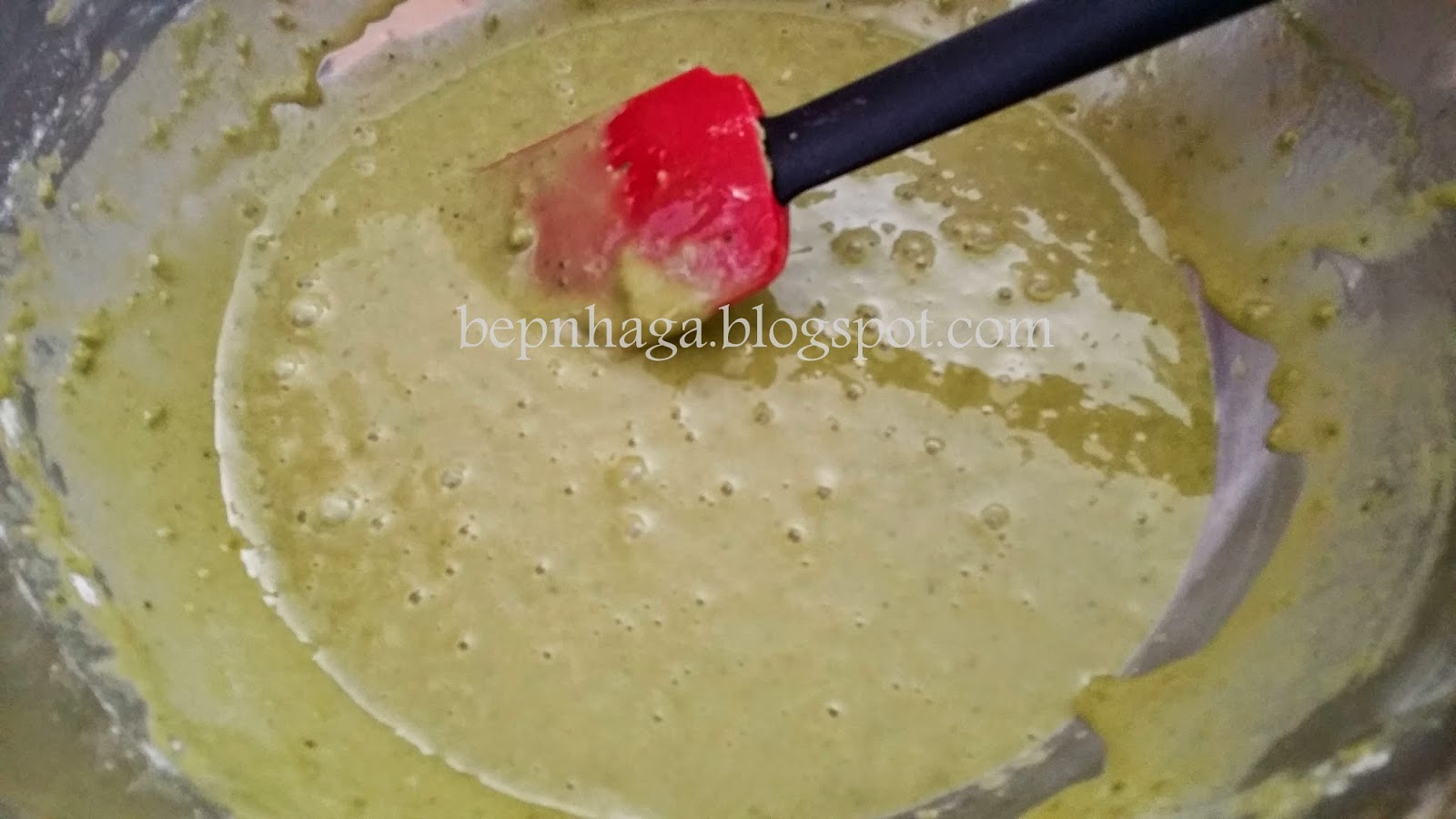 9. Cho phần bột vừa trộn vào khuôn bánh. Lắc nhẹ khuôn cho bột dàn đều.