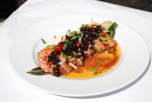 Bắc chảo lên bếp, cho khoảng 1 muỗng canh dầu ăn, phi thơm tỏi, cho hành tây, ớt, hành lá vào xào đến khi dậy mùi, nêm 2 muỗng cà phê hạt nêm, 1 muỗng cà phê đường, nếp cẩm vào xào nhanh tay, cho tôm vào xóc đều, bày ra đĩa. Ăn nóng.