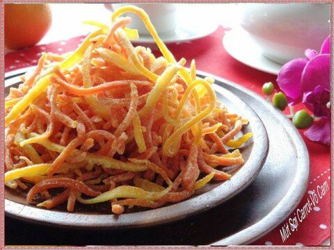 Chờ mứt sợi cà rốt vỏ cam nguội mới cho vào bao hay hủ đậy kín bảo quản nơi thoáng mát.