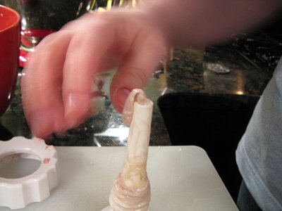 Lòng non gỡ bỏ hết phần mỡ dính vào cạnh ruột, gỡ cẩn thận kẻo rách. Lấy 1 đôi đũa ăn cơm kẹp vào đoạn ruột, tuốt từ đầu ruột đến cuối, mục đích là đẩy hết phần bột bột bám trong thành ruột ra ngoài.