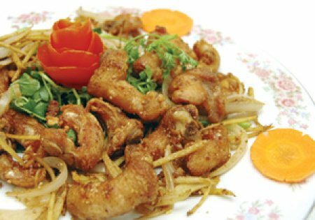 Hành tây xắt miếng, gừng xắt sợi cho vào chảo xào, cho chân gà vào xóc đều, nêm nước mắm vừa ăn.