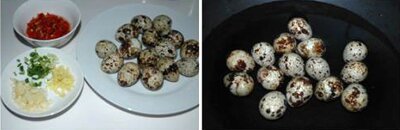 Đặt chảo lên bếp cho dầu ăn vào đun nóng. Cho trứng cút vào chiên đến khi da trứng vàng hơi nở phồng là được. Vớt trứng ra.