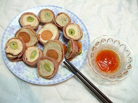 Trải miếng ức gà lên đĩa cho tỏi tây vào cuộn lại, làm tương tự như thế với xúc xích.