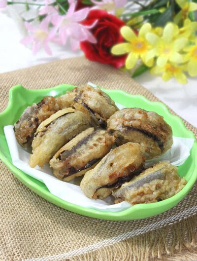 Nhúng miếng cà tím kẹp thịt vào bột chiên rồi cho vào chảo dầu nóng. Bột sẽ giúp tăng độ kết dính và tạo độ giòn kể cả khi món ăn đã nguội.