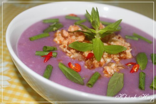 Phi hành cho thơm, đem tôm vào xào cho săn, đổ chút nước, cho khoai mỡ vào đun nhỏ lửa, nhớ quậy đều để khoai không bị cháy dưới đáy nồi. Khi khoai mềm, nhừ, nêm vừa ăn, nhắc xuống, rắc hành, ngò ôm lên trên.