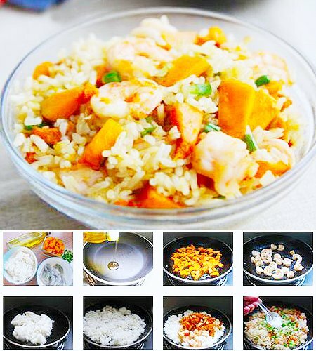 Cơm rang có thể được kết hợp với rất nhiều loại nguyên liệu. Hôm nay mình tận dụng tôm và bí đỏ sẵn có trong tủ lạnh.