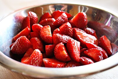 Thái lát mỏng dâu tây, rắc 1 thìa đường lên và xóc đều