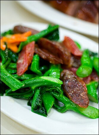 Tiếp tục thêm dầu vào chảo, phi thơm ½ hành còn lại, cho cải ngồng vào xào, khi rau gần chín trút lạp xưởng, nêm bột nêm, ớt, đảo đều tay. Tắt bếp, trút rau ra dĩa.