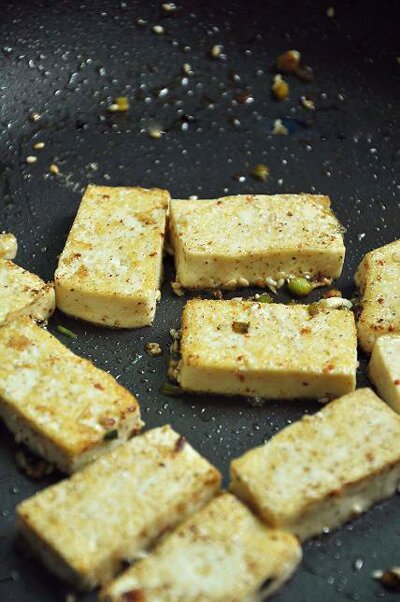 Có 2 cách làm với đậu: một là bạn rán sơ qua cho đậu hơi vàng; hai là chỉ cần chần đậu trong nước sôi có hòa chút muối