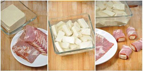 Đậu phụ cắt thành miếng cỡ ngón tay. Hành lá cắt nhỏ. Thịt xông khói lấy ra khỏi túi, cắt thành nhiều miếng vừa đủ cuộn gần 2 vòng quanh miếng đậu, khoảng 5 – 7cm