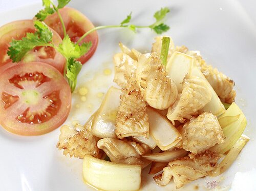 - Phi thơm tỏi, xào hành tây, hành lá, ớt với dầu ăn cho thơm. Cho mực và nước mắm chấm Knorr vào hỗn hợp, xào đều đến khi nước xốt sệt lại là được.