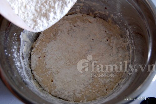 Khi bột đã nở lấy ra, cho muối và cho tiếp lượng bột còn lại vào. Dùng tay nhào cho mịn, dẻo (khoảng 2 đến 3 phút).