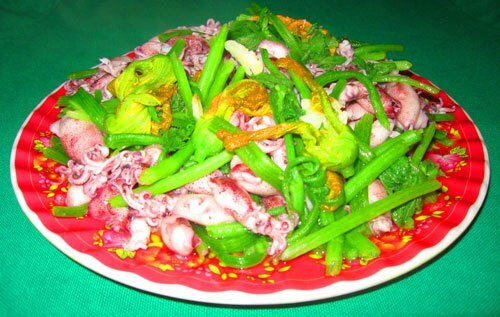 Một đĩa mực cơm xào đọt bí được gọi là “chuẩn” khi bụng mực màu trắng tinh, căng tròn, lưng mực màu hồng tím. Đọt bí xanh tươi còn bông bí vẫn giữ nguyên sắc vàng như lúc đang rung rinh trên bờ rào.