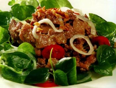 Thịt bò rửa sạch thái mỏng, ướp ít tỏi băm, hạt nêm và dầu ăn cho thấm. Rau càng cua bỏ lá sâu, rửa sạch, ngâm nước muối loãng, vẩy ráo, cho vào thố lớn. Hành tây bóc vỏ, xắt khoanh, cho vào hỗn hợp dầu giấm. Cà chua bi xắt lát. Phi tỏi, cho thịt bò vào thố rau, chan nước dầu giấm, hành tây và cà chua bi vào cùng.