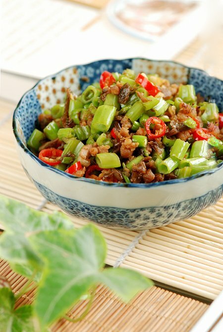 Vặn lửa thật to, cho rau muống thái khúc vào chảo thịt, đảo thật nhanh tay cho rau vừa chín tới, cọng còn độ giòn.