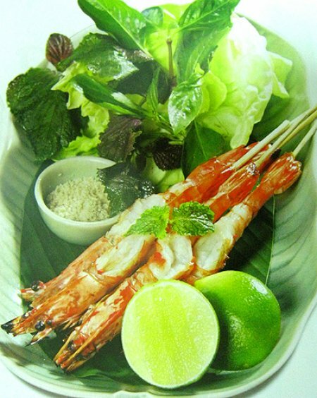 Tôm sú rửa sạch, bỏ vỏ phần thân, rạch lưng, ướp với muối, tiêu, tỏi ớt và rau thơm. Để 5 phút cho ngấm gia vị. Xiên tôm vào que, nướng trên lửa đến khi chín hồng.