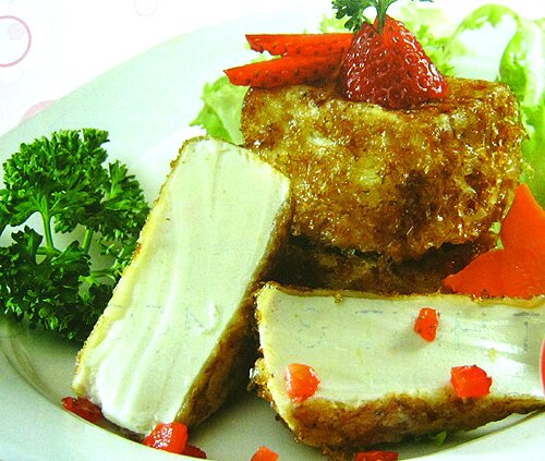 Lăn đậu hũ qua bột mỳ vừa đủ áo một lớp mỏng. Sau đó nhúng qua lòng trắng trứng, cuối cùng lăn qua cá bào.