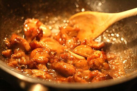 Đun nóng dầu, phi thơm hành tỏi rồi cho gà vào đảo cho săn thịt rồi nêm sốt me, dầu hào cho vừa miệng, nếu ăn cay có thể thêm chút ớt hoặc sate.
