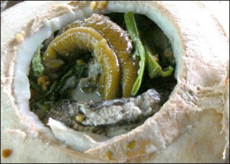 Dừa cứng cạy (1 trái), nhớ lựa dừa gáo to, có nước nhiều một chút mới ngon! Gọt bớt vỏ dừa cho gọn và vạt nắp (nhớ giữ nắp để đậy), đổ nước dừa ra tô. Lót rau ngổ vào trong gáo dừa, cho lươn vào giữa, trên cùng là lá cách. Cho nước dừa vào ngập xâm xấp lươn. Đậy nắp dừa lại và cho vào nồi chưng cách thủy khoảng 1 giờ cho nước dừa rút vào lươn là chín.Giở nắp dừa ra, rắc một nhúm đậu phộng rang giã giập vào, thế là xong! Món nầy phải ăn nóng với nước mắm thấm (tương hột, sả bằm, nước cốt dừa, đậu phộng giã nhuyễn) mới “đúng điệu”!
