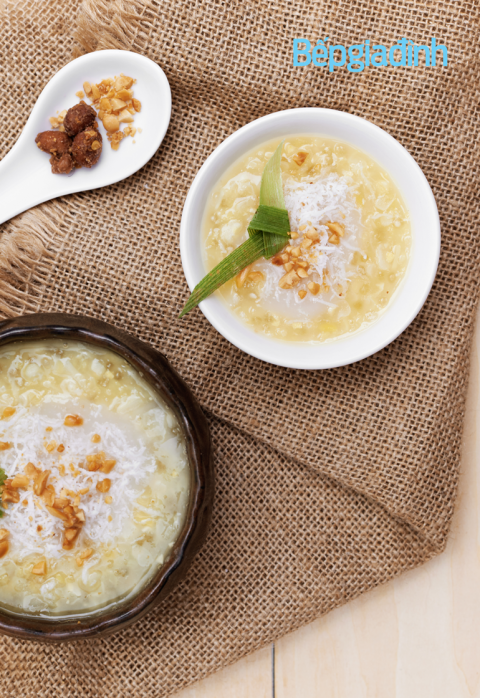 - Thêm bắp nếp vào nấu cùng trong 10 phút sau đó nêm đường vừa ăn. Thêm bột báng vào trộn đều, nấu lửa nhỏ trong 5 phút.