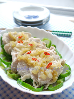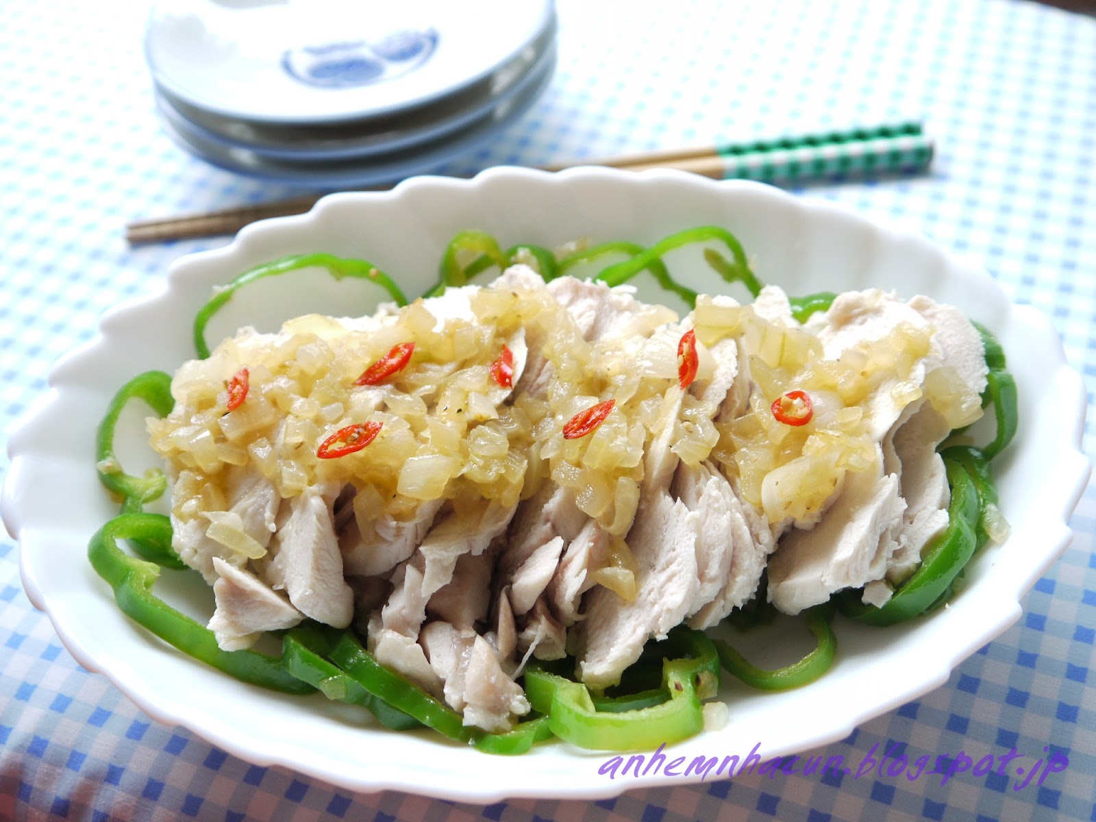 -Gà chín đem thái mỏng.Cho ớt xuống dưới đĩa,bày thịt gà lên trên ớt sau đó cho hành tây lên trên.Trang trí với vài lát ớt đỏ.