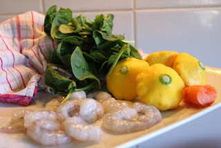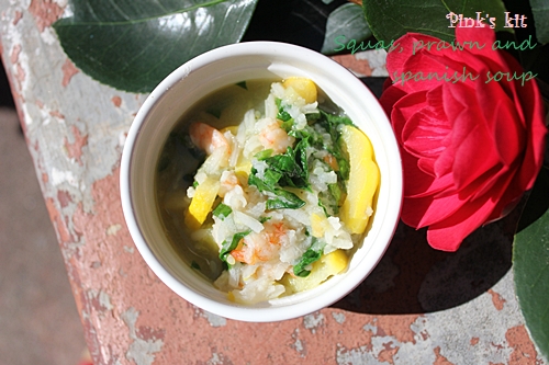 Rang gạo với dầu đến khi hạt gạo trắng đục cho tôm vào xào đến khi tôm chuyển màu đỏ hồng, cho nước xương hầm vào. Sau đó cho squash và cà rốt cắt nhỏ vào. Nấu sôi hạ lửa và nấu típ đến khi hạt gạo nở đều. Cho rau bó xôi cắt thiệt nhỏ vào, rùi tắt bếp và xay nhuyễn. Hay nếu nấu dạng lục cục thì nhớ mọi thứ cần cắt thiệt nhỏ.