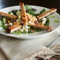 Rắc đậu xanh, ô liu kalamata và phô mai lên. Đặt dải bánh mì nướng đã cắt dài xung quanh salad và ăn ngay.