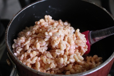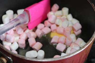 Cho bơ và marshmallowsvào nồi để lửa nhỏ, khi tan chảy trộn đều
