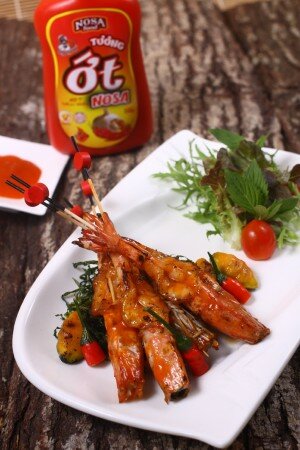 Tôm nướng có vị cay cay, giòn giòn, thơm nức mũi chấm với tương ớt càng tăng thêm vị đậm đà.